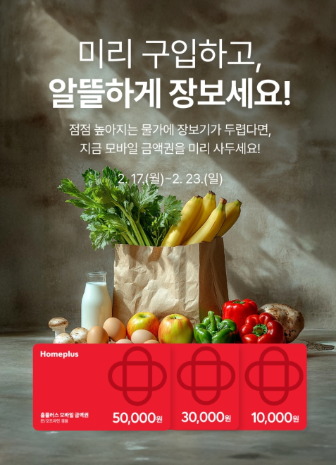 홈플러스에서 모바일 금액권을 5% 할인된 가격으로 한정 수량 판매합니다. 물가 상승 걱정 없이 미리 구매하여 알뜰하게 장볼 수 있는 기회입니다. 행사 기간은 2월 17일(월)부터 2월 23일(일)까지입니다.